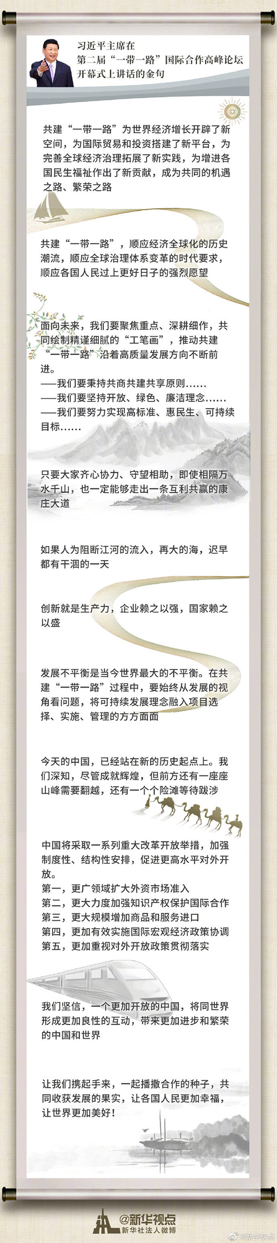 國家主席習(xí)近平26日上午在北京出席第二屆“一帶一路”國際合作高峰論壇開幕式并發(fā)表主旨演講。速覽習(xí)近平主席講話金句