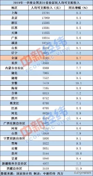 近日,國(guó)家統(tǒng)計(jì)局陸續(xù)公布2019年一季度全國(guó)及各省居民人均可支配收入數(shù)據(jù)。數(shù)據(jù)顯示,一季度全國(guó)居民人均可支配收入為8493元,比上年同期名義增長(zhǎng)8.7%,扣除價(jià)格因素后實(shí)際增長(zhǎng)6.8%。