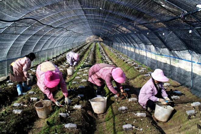 楚雄彝族自治州大姚縣新街鎮(zhèn)下西沖小組充分利用滬滇幫扶項目資金,整合貧困戶每戶5000元的產(chǎn)業(yè)扶持發(fā)展資金,通過和楚雄州技師學院簽訂技術(shù)合作協(xié)議,共流轉(zhuǎn)土地100畝,建設(shè)羊肚菌種植示范基地。2018年,新街鎮(zhèn)種植的羊肚菌畝產(chǎn)達230公斤,產(chǎn)值達368萬元。圖為村民正在采摘羊肚菌。 新街鎮(zhèn)供圖