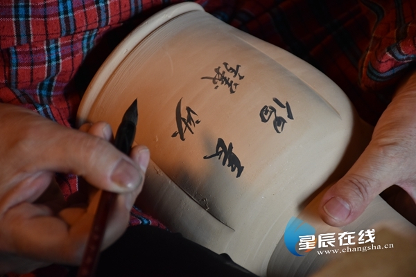 拉胚完成后,就輪到退休后居住在彩陶源村的季征先生上場(chǎng)了。這位書(shū)法名家,花了一天功夫,用一種特別調(diào)制的顏料,把“長(zhǎng)沙倡議”這四個(gè)字,一個(gè)字一個(gè)字的,書(shū)寫(xiě)在每一個(gè)陶瓷上。