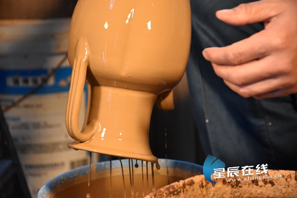 (長(zhǎng)沙銅官窯“非遺”傳人周世洪大師為陶坯上釉。)