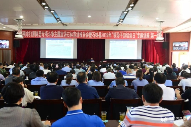 昆明信息港訊 通訊員侍偉 4月26日,昆明市掃黑除惡專項斗爭主題宣講石林宣講報告會暨石林縣2019年“領(lǐng)導(dǎo)干部培訓(xùn)日”專題講座第一講在縣行政中心報告廳舉行。縣級領(lǐng)導(dǎo)、全縣實職副科以上領(lǐng)導(dǎo)干部以及基層農(nóng)民群眾代表、企業(yè)代表、青年代表、婦女代表、法律工作者代表聆聽宣講報告。