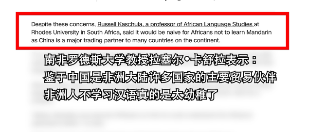 CNN援引南非羅德斯大學(xué)的非洲語言研究教授拉塞爾?卡舒拉的話說:“鑒于中國是非洲大陸許多國家的主要貿(mào)易伙伴,非洲人如果不學(xué)習(xí)漢語就有些無知了。”