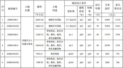 關(guān)上街道本次掛出地塊編號為J2008-058-C、D2、E、G、H1、H2 ,總出讓面積約150畝,起價為179160萬元。含住宅用地面積約94.5畝,商業(yè)用地約45畝,教育用地約10.5畝。其中,住宅地塊容積率在4.65-5.05之間,教育用地容積率0.85,商業(yè)地塊容積率1.1-4.5。六個地塊最大可建面積約40.3萬方。