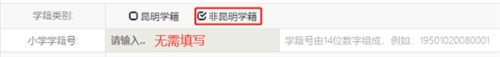 非就讀于昆明市轄區(qū)內(nèi)小學(xué)的報名學(xué)生,選擇非昆明學(xué)籍,不需要填寫學(xué)籍號。如下圖所示: