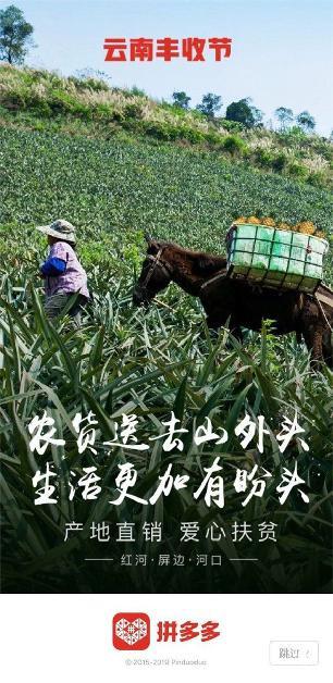 4月7日,拼多多“云南豐收節(jié)”走進(jìn)紅河州河口縣以及屏邊縣、紅河縣兩個國家級貧困縣,帶動當(dāng)?shù)夭ぬ}、小土豆、水果玉米等農(nóng)產(chǎn)品大規(guī)模上行,并借此契機(jī),向4億消費(fèi)者推廣普及大理獨(dú)頭蒜、老班章普洱茶、文山三七粉等帶有地區(qū)品牌屬性的特色農(nóng)產(chǎn)品。