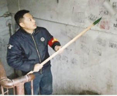 母順康在清理老舊小區(qū)樓道內(nèi)的小廣告。資料照片