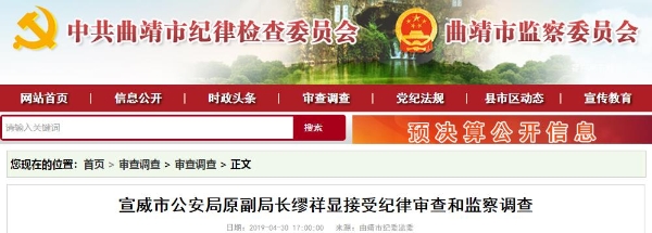 昆明信息港訊 4月30日,從曲靖市紀(jì)委市監(jiān)委網(wǎng)站獲悉,據(jù)宣威市紀(jì)委監(jiān)委消息:宣威市公安局原副局長繆祥顯涉嫌嚴(yán)重違紀(jì)違法,目前正接受紀(jì)律審查和監(jiān)察調(diào)查。