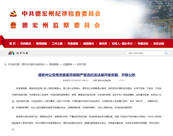 昆明信息港訊 4月30日,從德宏州紀(jì)委監(jiān)委網(wǎng)站獲悉,德宏州公安局黨委委員楊剛嚴(yán)重違紀(jì)違法被開除黨籍、開除公職。