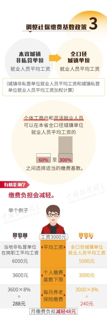 舉個(gè)例子,假設(shè)你的月薪為3000元,當(dāng)?shù)胤撬綘I單位在崗職工平均工資為6000元,在調(diào)整之前,你的要按照60%的社保繳費(fèi)下限也就是3600元來繳費(fèi),每月繳費(fèi)是288元。