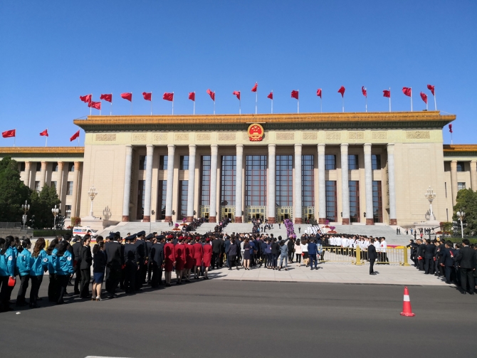 △上午8點(diǎn)半,與會(huì)者在人民大會(huì)堂東門外排隊(duì)入場(chǎng)。(央視記者馬立飛拍攝)