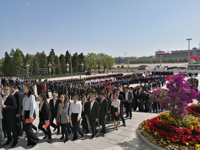 △現(xiàn)場(chǎng)的四個(gè)彩色方陣是來自清華大學(xué)(紫色),北京大學(xué)(白色),中國(guó)人民大學(xué)(紅色),北京師范大學(xué)(藍(lán)色)的大學(xué)生代表。(央視記者周志國(guó)拍攝)