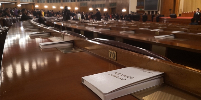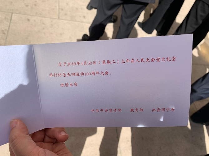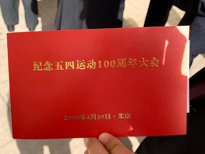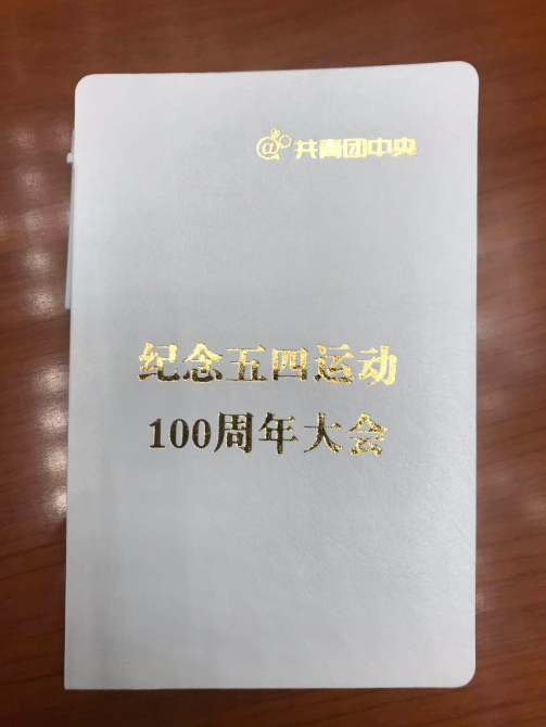 △每一位參會(huì)者面前都擺放著一本封面印有“紀(jì)念五四運(yùn)動(dòng)100周年大會(huì)”的筆記本。(央視記者鐘鋒拍攝)