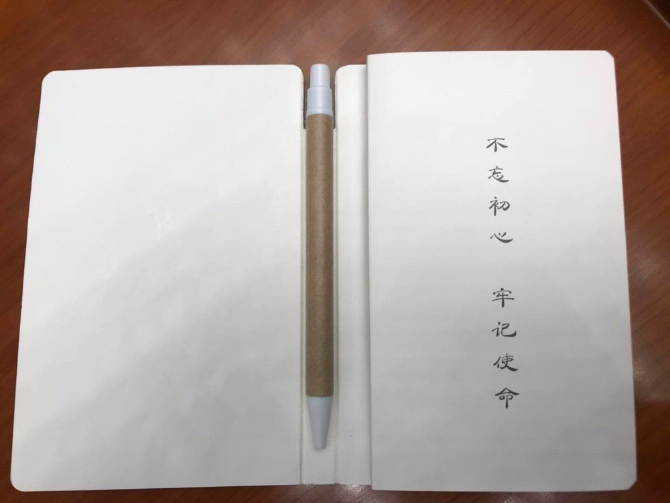 △與會(huì)者筆記本內(nèi)頁(yè)上寫著“不忘初心、牢記使命”。(央視記者荊偉拍攝)
