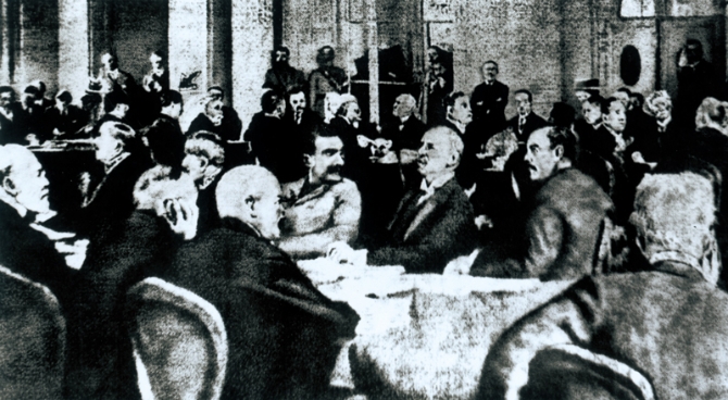 近代以來(lái),帝國(guó)主義列強(qiáng)的侵略使中國(guó)逐步淪為半殖民地國(guó)家,帝國(guó)主義和中華民族的矛盾成為近代中國(guó)社會(huì)的主要矛盾之一。1919年1月,第一次世界大戰(zhàn)戰(zhàn)勝?lài)?guó)在法國(guó)巴黎召開(kāi)和會(huì),把持和會(huì)的英法美等列強(qiáng)無(wú)視中國(guó)也是戰(zhàn)勝?lài)?guó)之一,不顧中國(guó)民眾呼聲,竟然決定將戰(zhàn)敗國(guó)德國(guó)在中國(guó)山東的權(quán)益轉(zhuǎn)讓給日本。在巴黎和會(huì)中,中國(guó)政府的外交失敗,激起了中國(guó)民眾的強(qiáng)烈不滿,從而引發(fā)了五四運(yùn)動(dòng)。圖為巴黎和會(huì)會(huì)場(chǎng)。 北京新文化運(yùn)動(dòng)紀(jì)念館供圖