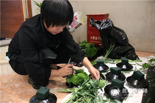 “我喜歡將花的品種、味道混合,把不同的顏色、大小拼湊在一起?!闭f話同時(shí),劉艷麗麻利地卷起衣袖,將一株綠毛球插進(jìn)了花泥里。完成這樣一個(gè)大型作品,她需要兩小時(shí)左右,小型作品的時(shí)間,則控制在半小時(shí)以內(nèi)。