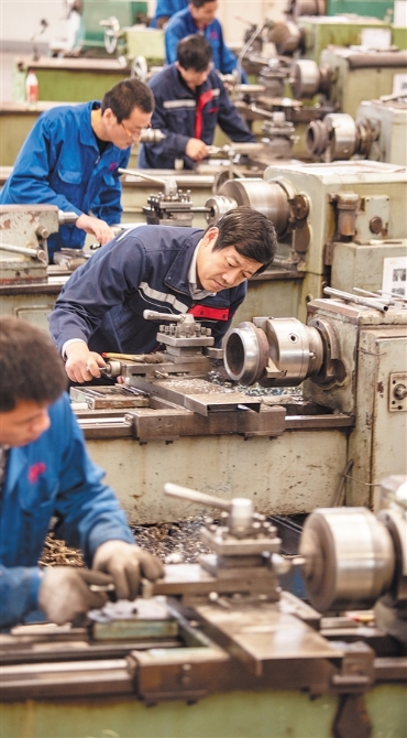 5月2日,位于山東省日照經(jīng)濟技術(shù)開發(fā)區(qū)的山東雙港活塞有限公司工藝裝備車間,全國五一勞動獎章獲得者李為剛(中)帶領“青年突擊隊”開展技術(shù)攻關(guān)。作為一線工人的李為剛曾先后獲得國家實用新型專利7項,國家發(fā)明專利2項。 田 磊攝(中經(jīng)視覺)