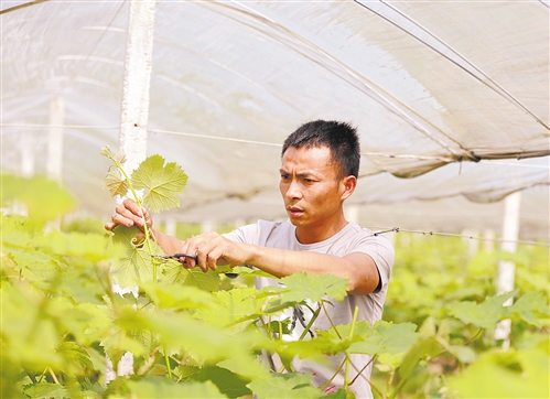 5月2日,江西省吉水縣醪橋鎮(zhèn)西坑村生態(tài)家庭農(nóng)場,劉國富在葡萄園剪枝。劉國富從北京返鄉(xiāng)創(chuàng)辦了國富生態(tài)家庭農(nóng)場,帶領當?shù)匕傩彰撠氈赂弧?廖 敏攝(中經(jīng)視覺)