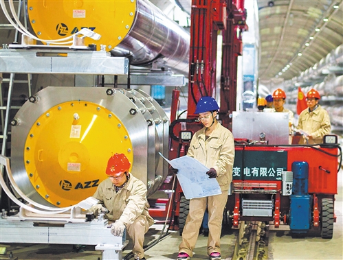 5月1日,江蘇省常熟市,全球首條特高壓輸變電工程蘇通GIL綜合管廊電氣施工現(xiàn)場,“90后”博士生陳春超(左一)與“90后”碩士生原睿萌(左二)在組裝管廊電氣設備。該工程項目全長5468.5米,被稱為“萬里長江第一廊”。湯德宏攝(中經(jīng)視覺)