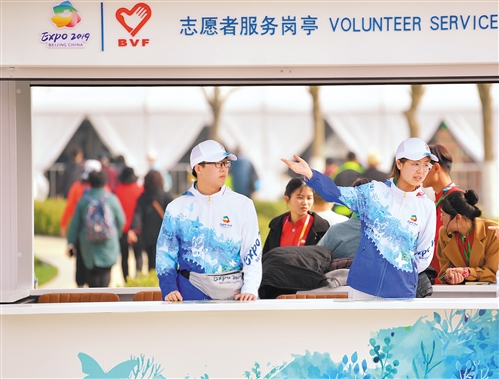 5月1日,北京世園會,來自北京郵電大學世紀學院的大學生志愿者徐小雯(右一)在為游客熱情服務。本報記者 高興貴攝