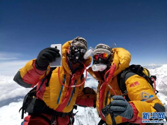 2016年,登山向?qū)骼蚀稳?右)第一次登頂珠峰,在峰頂與同伴合影留念(資料照片)。新華社發(fā)