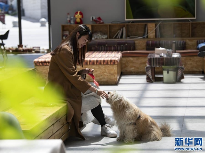 關(guān)嫻在拉薩自己開(kāi)的客棧里與寵物互動(dòng)(4月10日攝)。新華社發(fā)(孫非攝)
