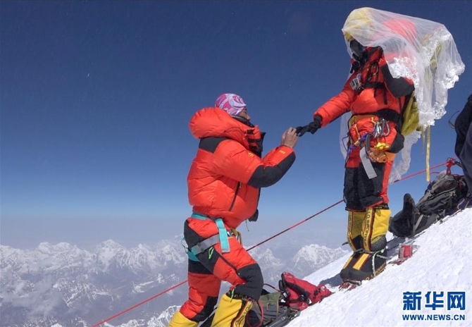 珠穆朗瑪峰頂,王銀龍向關(guān)嫻求婚(2018年5月16日攝)。新華社發(fā)