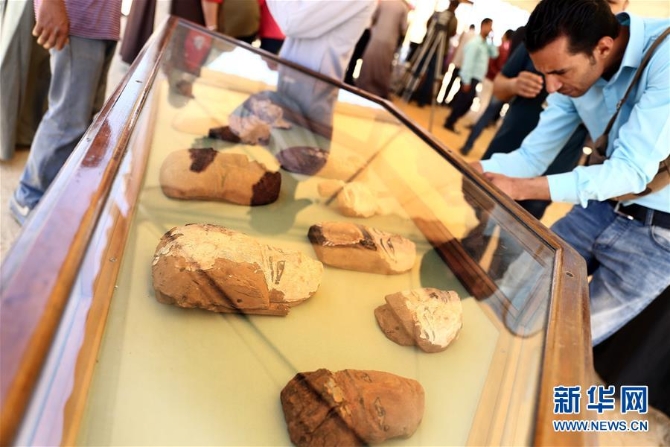 這是5月4日在埃及吉薩拍攝的出土文物。埃及最高文物委員會秘書長穆斯塔法·瓦齊里4日在一份聲明中說,埃及一支考古隊在吉薩高地大金字塔附近發(fā)掘出一處埃及古王國時期(公元前2686年至公元前2181年)的墓地。新華社發(fā)(艾哈邁德·戈馬攝)