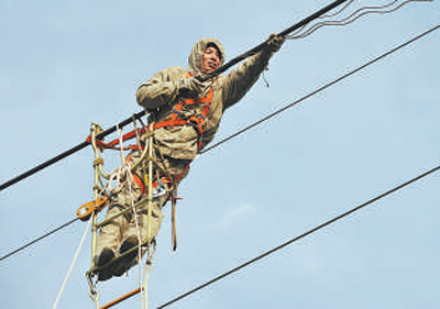?許啟金穿著屏蔽服在220千伏輸電線路上帶電消缺。張勇/攝(影像中國)