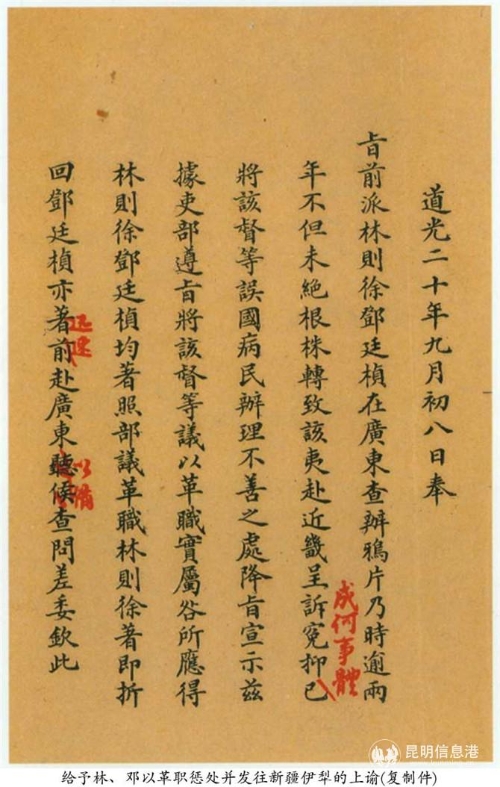 虎門銷煙后,中英爆發(fā)鴉片戰(zhàn)爭,清軍一再失利。驚慌失措的道光帝遷怒于林則徐,借口“營務(wù)廢弛”,革去其四品卿銜,與另一位抗英主將鄧廷楨一起流放新疆伊利。“從重發(fā)遣伊犁,效力贖罪”。身不由己的林則徐,典賣舊居,自籌路費,踏上漫漫流放路。道光二十二年(1842年),林則徐到達伊犁惠遠城,開始了他在新疆的3年流放生活。