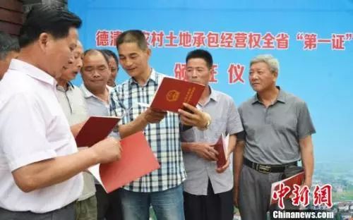 資料圖:村民代表領(lǐng)到了新的農(nóng)村土地承包經(jīng)營權(quán)證 王力中提供