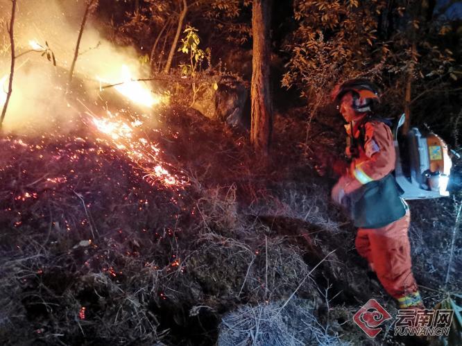 ?19時30分,支隊第一組到達(dá)火場。經(jīng)勘察,火場風(fēng)力2—3級,植被類型為針闊葉混交林,主要樹種以云南松為主,火勢主要向東北方向蔓延,火場海拔2096米。