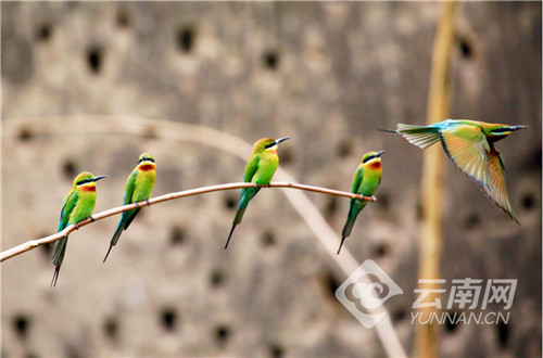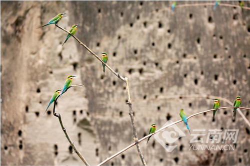 每年從4月初開始,數(shù)以萬計的栗喉蜂虎陸續(xù)到達巧家縣的江邊河谷地帶度夏筑巢繁衍后代,將鳥巢筑在沿江沙巖壁上。它們5月中下旬到7月初繁殖幼鳥,8月初帶著兒女逐漸離開。