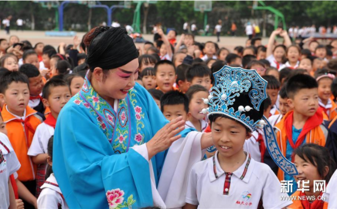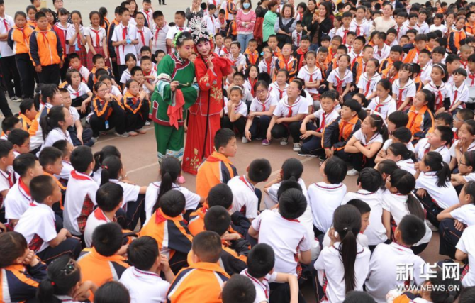 5月8日,滄州市小鳳霞評劇團演員在肅寧縣第三實驗小學與學生互動。新華社記者朱旭東/攝