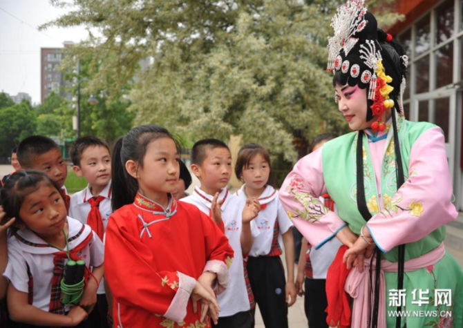 5月8日,滄州市小鳳霞評劇團演員在肅寧縣第三實驗小學與學生互動。 新華社記者朱旭東/攝