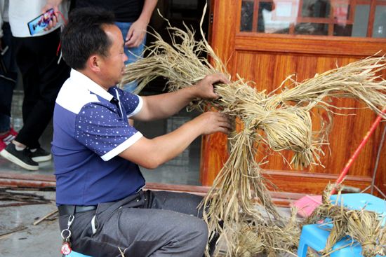 5月8日,距離端午節(jié)還有一個月,記者在老懂寨看到,幾位老人正在忙著扎稻草。用鐵絲把干稻草扎成小捆,再彎曲形成固定形狀,插入小竹片固定,一只小狗就做成了。據(jù)介紹,這是兜陽文化傳承館里的展示用品。他們將扎9只狗,因以前男人會帶狗上山打獵,以此表示“鬧兜陽”祭祀中的9個男人。