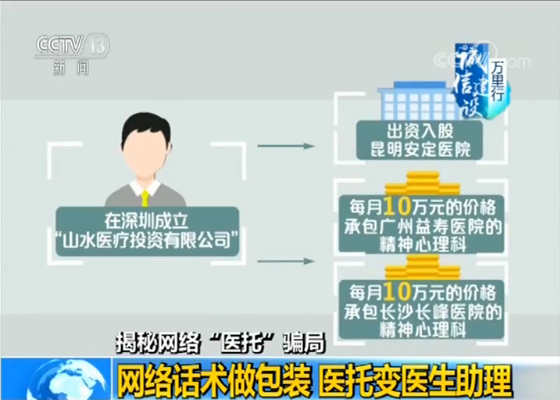 根據深圳警方介紹,這起“醫(yī)托”案件幕后的出資人為福建人蘇某閃,他在深圳成立了“山水醫(yī)療投資有限公司”,出資入股了昆明安定醫(yī)院,另外還以每月10萬元的價格,分別承包了廣州益壽醫(yī)院和長沙長峰醫(yī)院的精神心理科,而這3家醫(yī)院均為民營醫(yī)院。