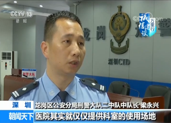 深圳龍崗區(qū)公安分局刑警大隊二中隊中隊長 梁永興:醫(yī)院其實就僅僅提供科室的使用場地,科室的醫(yī)生、設備、護士等等一切跟醫(yī)療有關的運作,所有的儀器、器械、人員都是由蘇某(閃)來招聘,買進來的,跟醫(yī)院其實是沒有關系的,只是它掛了醫(yī)院的名稱。