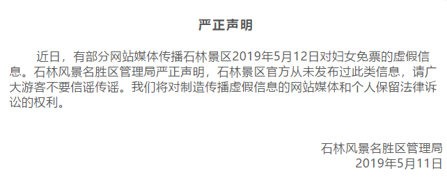 昆明信息港訊(昆明日報 李思凡)針對部分網(wǎng)站媒體“石林景區(qū)2019年5月12日對婦女免票”的虛假信息,5月11日,石林風(fēng)景名勝區(qū)管理局發(fā)布聲明,石林景區(qū)官方從未發(fā)布過此類信息,請游客不要信謠、傳謠。同時,管理局將對制造傳播虛假信息的網(wǎng)站媒體和個人保留法律訴訟的權(quán)利。