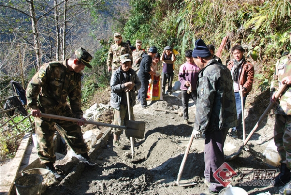 獨龍江邊境派出所民警與村民一同修路。獨龍江邊境派出所供圖