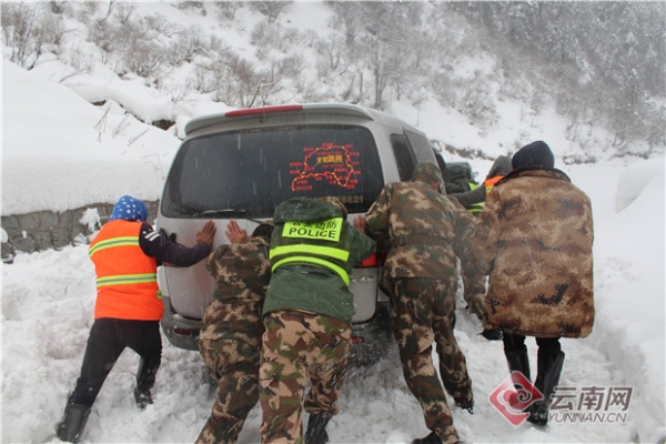 獨龍江邊境派出所民警齊心協(xié)力推動陷入雪中的車輛。獨龍江邊境派出所供圖
