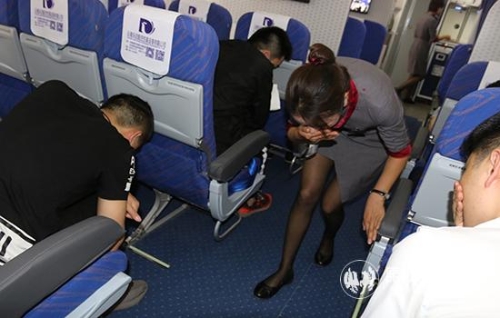 乘務(wù)員安撫旅客并引導(dǎo)旅客俯身低頭捂住口鼻
