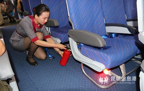 模擬座椅背后鋰電池失火,乘務(wù)員進(jìn)行滅火處置1
