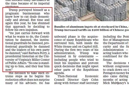 “他把自己描繪成一個(gè)務(wù)實(shí)的商人”,但是“他只是想做什么就做什么,憲法該死、制度該死、專(zhuān)業(yè)防護(hù)措施該死,”弗吉尼亞大學(xué)米勒公共事務(wù)中心的總統(tǒng)歷史學(xué)家芭芭拉·佩里說(shuō):“他所在黨派的領(lǐng)導(dǎo)人都很可惡,”“沒(méi)有人站起來(lái)對(duì)抗他,他們現(xiàn)在害怕他?!?br data-filtered="filtered"/>人心向背,可見(jiàn)一斑。