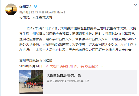 昆明信息港訊 據(jù)云南省大理州賓川縣人民政府官方微博消息,2019年5月14日17時,賓川縣州城鎮(zhèn)老趙村委會三電桿發(fā)生森林火災(zāi)?;鹎榘l(fā)生后,州城鎮(zhèn)立即啟動應(yīng)急預(yù)案,迅速組織撲救。同時,縣森林防火指揮部迅速啟動應(yīng)急預(yù)案,組織縣專業(yè)撲火隊、各鄉(xiāng)鎮(zhèn)半專業(yè)撲火隊和干部群眾共計485人趕赴火場撲救。