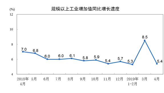 記者從國家統(tǒng)計(jì)局獲悉,2019年4月份,規(guī)模以上工業(yè)增加值同比實(shí)際增長5.4 %(以下增加值增速均為扣除價(jià)格因素的實(shí)際增長率),比3月份回落3.1個(gè)百分點(diǎn)。從環(huán)比看,4月份,規(guī)模以上工業(yè)增加值比上月增長0.37%。1-4月份,規(guī)模以上工業(yè)增加值同比增長6.2%。