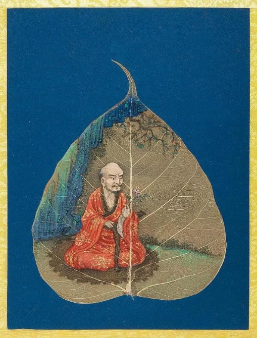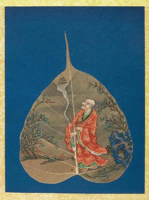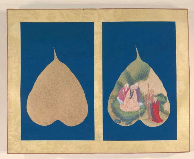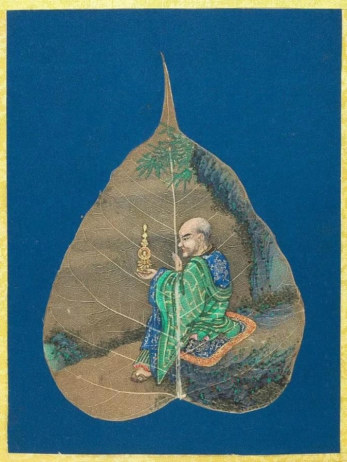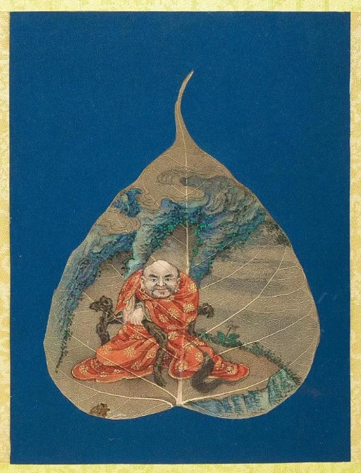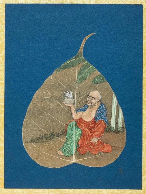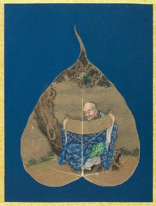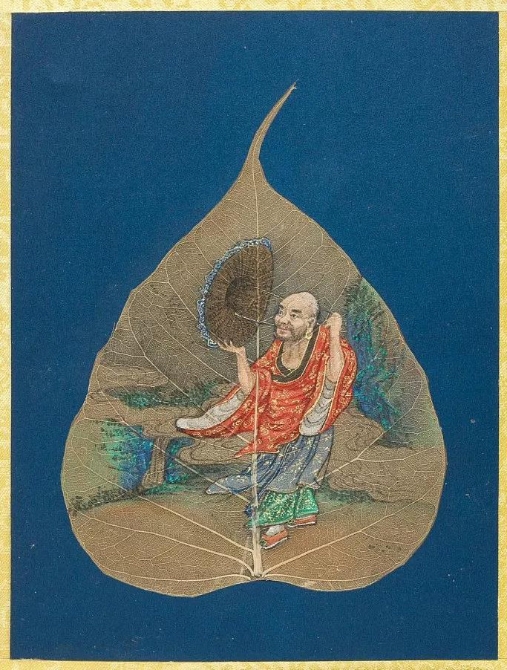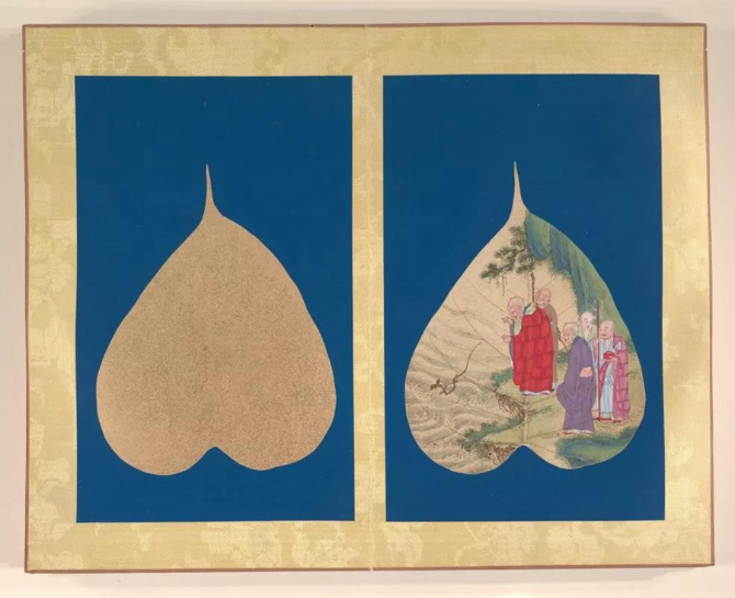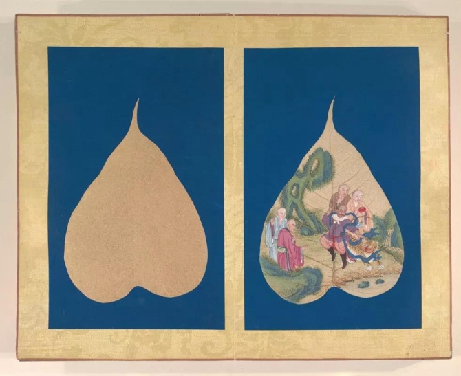 以菩提葉為素材媒介創(chuàng)作的畫冊《菩提葉畫十八羅漢圖》,將多彩的畫面和諧地與樹葉的肌理自然美融為一體。此套含十八幀,約繪制于17到18世紀西藏地區(qū),現(xiàn)藏于美國大都會藝術博物館。