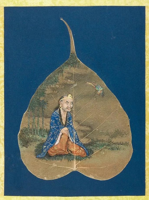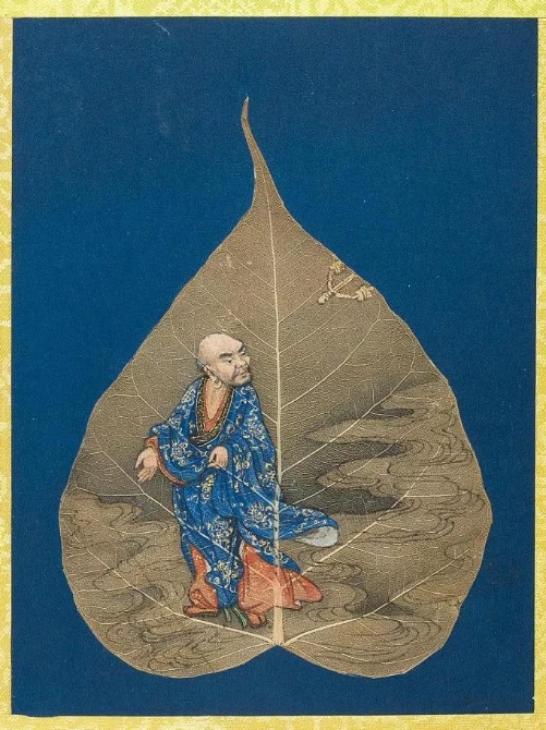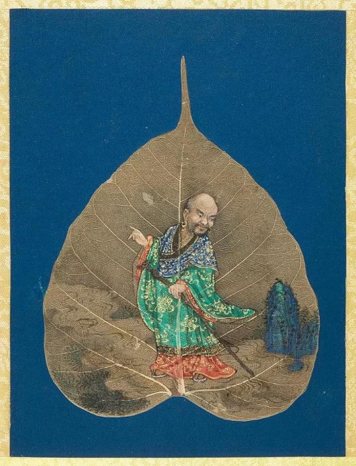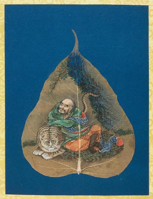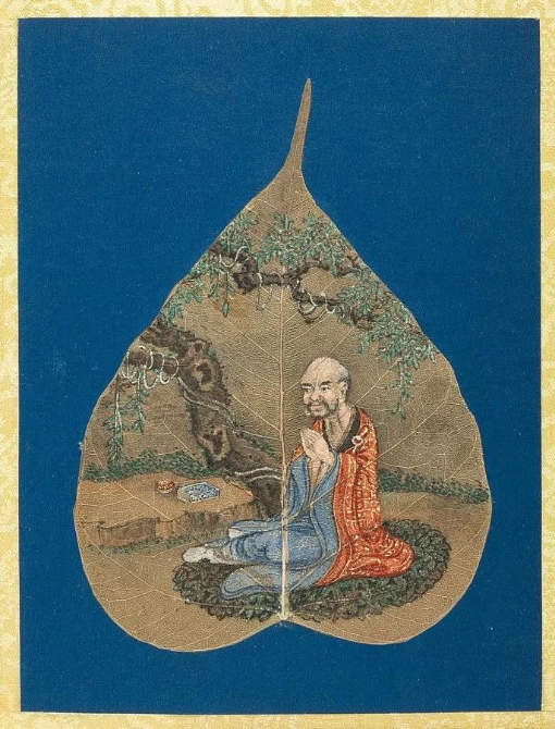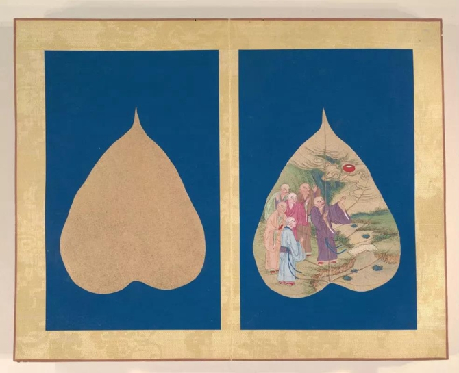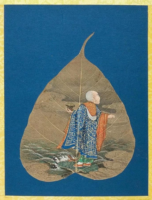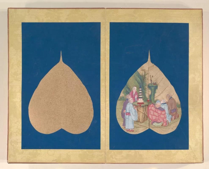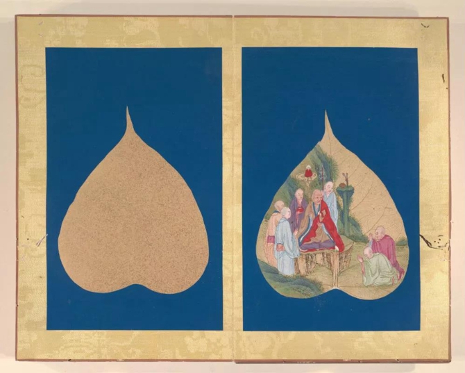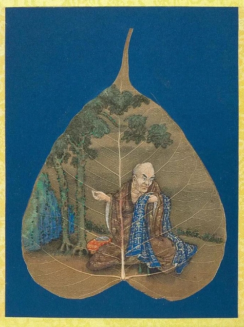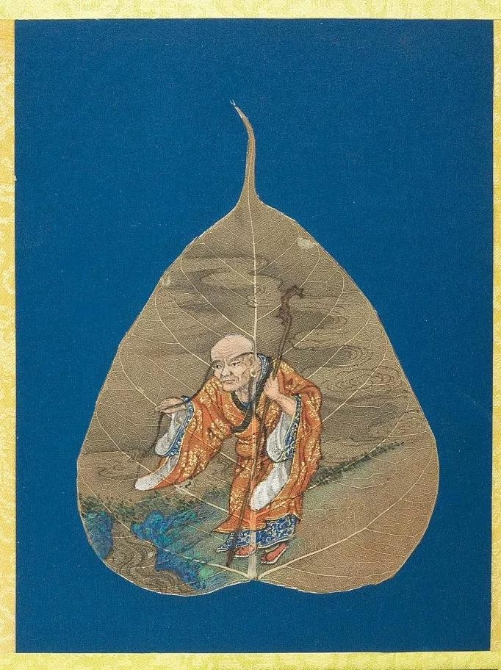 以菩提葉為素材媒介創(chuàng)作的畫冊《菩提葉畫十八羅漢圖》,將多彩的畫面和諧地與樹葉的肌理自然美融為一體。此套含十八幀,約繪制于17到18世紀西藏地區(qū),現(xiàn)藏于美國大都會藝術博物館。