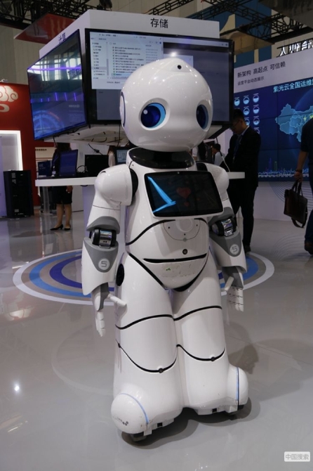 紫光云技術(shù)有限公司攜優(yōu)友U05類人型商用服務(wù)機器人亮相第三屆世界智能大會。