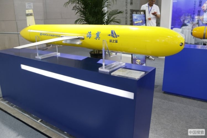 天津深之藍海洋設(shè)備科技有限公司展示“海翼”號水下滑翔機。
